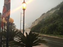Nachdem ich gestern noch am Abend am Strand bei herrlichem Sonnenuntergang Pizza gegessen habe und danach voller Tatendrang und Vorfreude ins Bett gegangen bin, musste ich nach dem Aufwachen und dem ersten Blick aus dem Fenster erst die Uhr dreimal checken; ich dachte, es wäre fünf Uhr in der Frühe, dabei war es schon kurz nach acht, aber der Himmel war völlig dunkel und daran hat sich bis zum Mittag nichts geändert. Das Bild ist von 11 Uhr. Nach kurzer Überlegung habe ich mich dann entschlossen, noch einen Tag hier in Gibraltar zu bleiben, das wäre wahrlich kein schöner Auftakt gewesen, die Tour bei strömendem Regen zu beginnen. Der Wetterbericht verspricht für morgen besseres Wetter. Na, dann wird das Wochenende eben komplett durchgeradelt. Shit happens