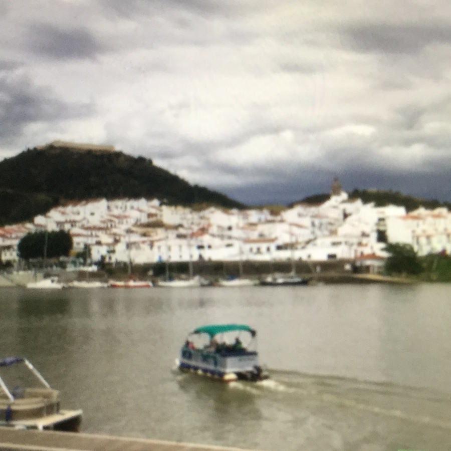 Als ich dann am Grenzfluss Rio Guadiana ankam, war wieder ' mal andere Welt; wo bei uns jetzt jede Menge Wegweiser stünden, war hier überhaupt nichts zu sehen von irgendeiner Möglichkeit, nach Portugal zu gelangen. Ich habe mich dann durchgefragt zu einem Mickymausanleger, der bei manchem Wannsseesegler schon Naserümpfen auslösen würde. In der Bar am Ufer wurde mir auf Nachfrage erklärt, das ich mich einfach ans Ufer stellen soll, der portugiesische Fährmann würde mich irgendwann sehen und dann hinüber kommen, um mich zu holen. Nachdem ich dann dort eine Weile den Hampelmann gemacht habe, kam tatsächlich ein Böötchen über den Fluss, und so bin ich dann doch glücklich in Portugal gelandet.