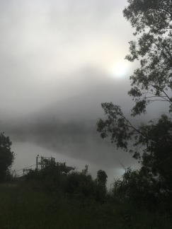 3 km weiter angehalten, um zu frühstücken, da es in meiner kleinen Pension keines gab. Warum glücklicherweise? Weil ich nach dem Frühstück realisiert habe, das ich meinen Pass vergessen hatte und so nur 3 km und nicht etwa 20 oder 25 km zurückfahren musste. Ich bin dann durch wiederum herrliche Gegend gefahren, habe mir kein Stress gemacht und mir nur das Ziel " Grenzfluss" gesetzt. Trotzdem wurde es noch hektisch, weil plötzlich riesige schwarze Wolken den Himmel bedeckten und dann das herunterkam, was der Meteorologe verschämt " Schauer" nennt. Als Radler inmitten freier Natur weicht dich so ein Schauer von 15 oder 20 Minuten Dauer aber komplett auf.