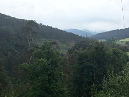 Heute habe ich 70 km bei 1400 Höhenmetern absolviert, wobei mir die letzten Kilometer endlos lange vorkamen. Ich habe die Befürchtung, das die mehrfachen Durchfeuchtungen durch die Regenschauer und die Lufttrocknung der nassen Klamotten im Fahrtwind bei 20 Grad doch gesundheitliche Spuren hinterlassen haben. Wenn ich mich morgen nicht entscheidend bessser fühle, bleibe ich einen Tag im Bett, zumal ich hier ein prima Hotelzimmer mit Balkon und Panoramablick habe. Ich bin jetzt in Asturien gelandet, die Landschaft ist völlig anders als in Galicien, lieblich-hügelig mit viel Blumen und Palmen am Straßenrand, sehr hübsch anzuschauen. Heute Abend kam sogar die Sonne mal wieder für längere Zeit zum Vorschein.