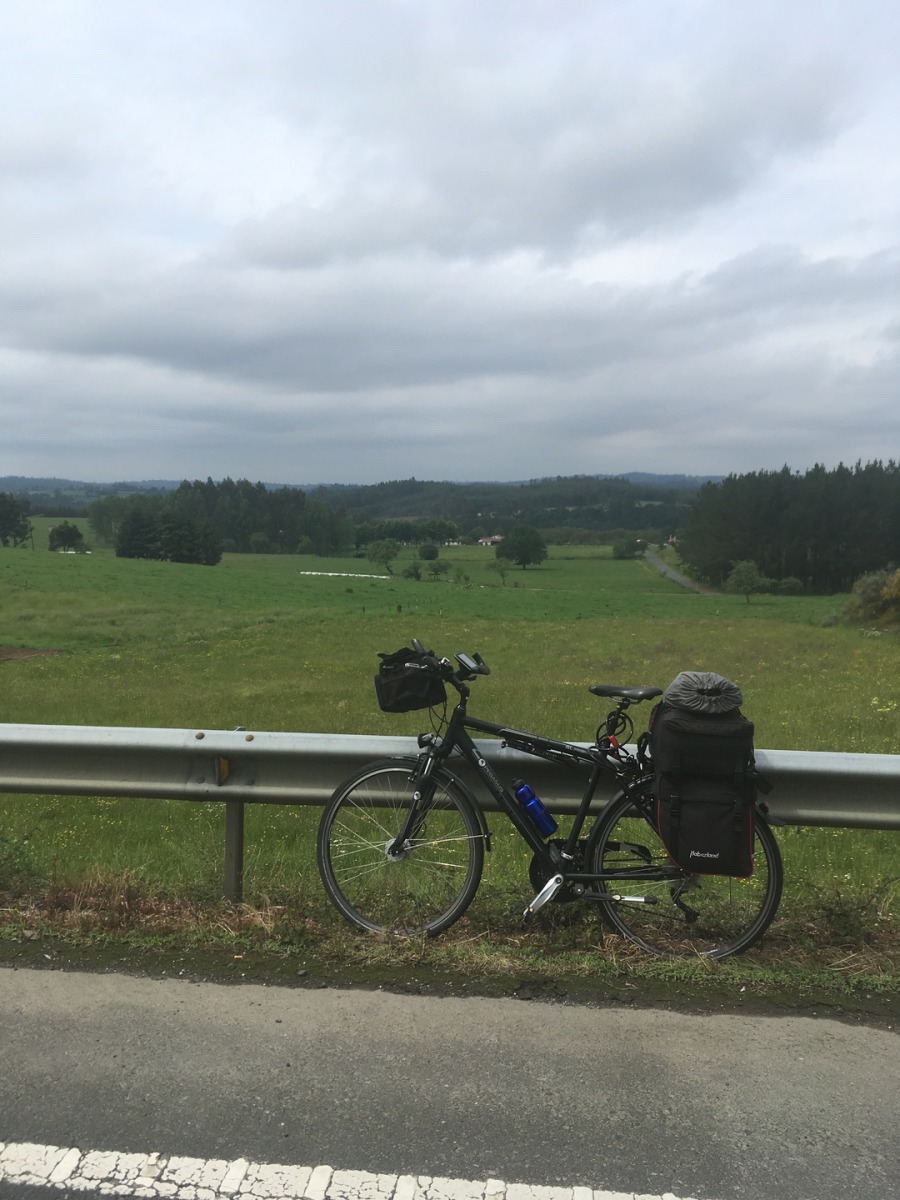 Die ausgesprochen netten Hotelangestellten haben mir gleich einen Werkstatttermin besorgt, so das ich mit neu ausgerichtetem Hinterrad dann um 12.30 Uhr endlich losfahren konnte. Da es ein Spezialladen für Rennräder war, habe ich jetzt zwischen meinen normalen silbernen Speichen vier mattschwarze Rennradspeichen am Hinterrad- mein braves Tourenrad ist jetzt sozusagen getuned, da stellt sich gleich so ein gewisses Manta-Gefühl ein - jetzt muss ich nur noch herausbekommen, wo ich hier in den galizischen Bergen einen Fuchsschwanz herbekomme.