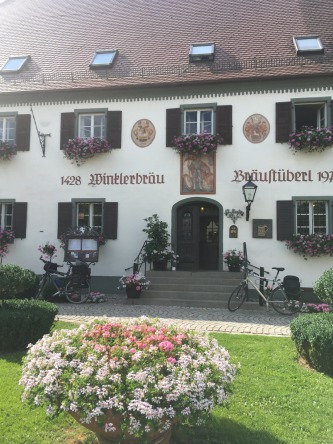 Wir haben an einem urigen und ziemlich edlen Brauereigasthof zum Essen haltgemacht und uns dann spontan entschlossen, hier auch zu übernachten. Das Zimmer ist prima, die Sauna nach der Tour sehr entspannend und jetzt sehen wir beide mit Freunde dem bayerischen Abendessen entgegen.