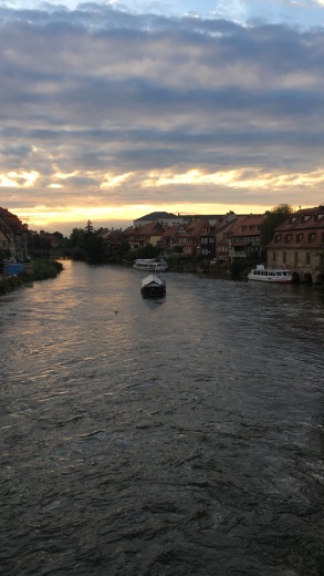 Ich habe ein sehr gutes Frühstück bekommen, die Sonne lachte vom Himmel und die Bamberger Shilouette zeigte sich bei meiner Abreise auf der Fahrt am gegenüberliegenden Flussufer entlang noch einmal in aller Pracht vor dem blau-weißen bayerischen Himmel.