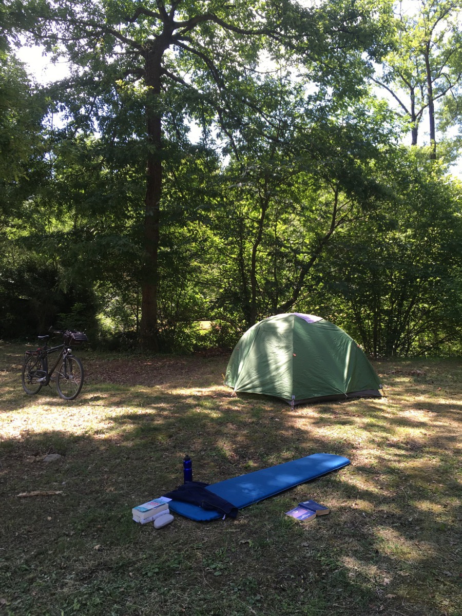 Ich habe herrlich geschlafen. Nachdem ich dann am Morgen wieder eine Stunde vor dem Zelt liegend den Vögeln zugehört habe, bin ich zum Frühstücken und danach habe ich den ganzen Tag lesend, dösend und nachdenkend vor dem Zelt im Schatten der alten Bäume verbracht bei endlich wieder hochsommerlichem Wetter.