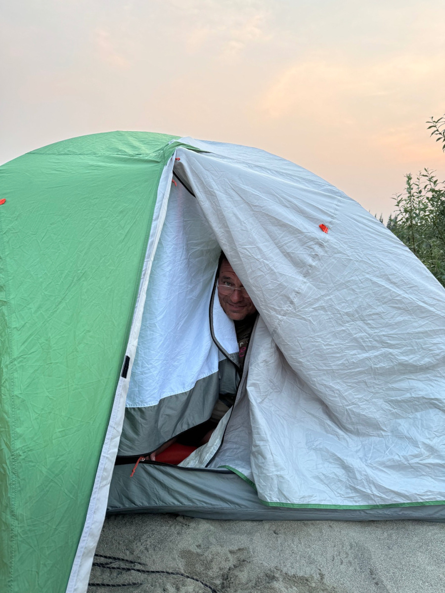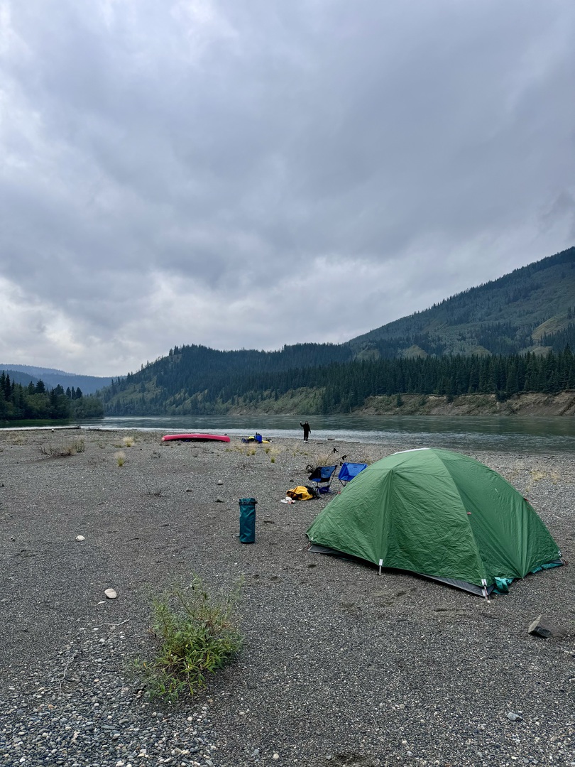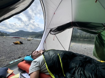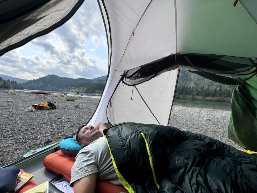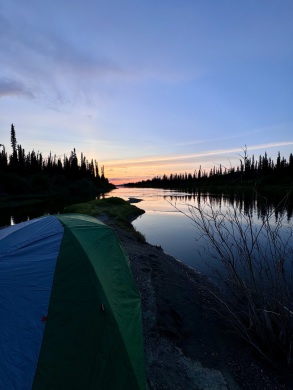 An einer großen Flussschleife haben wir auf einer langen breiten Sandbank, die wir unter Einsatz unserer vollen Paddelkraft noch erreichen konnten, unser Lager aufgeschlagen. Das Zelt trocknete in