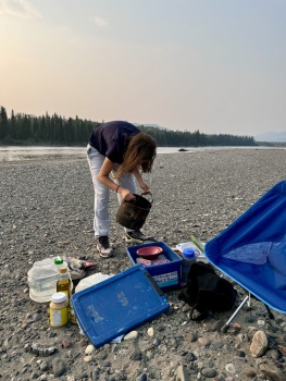 Es folgten ein Flussbad und das allabendliche Herrichten des Lagers - Zelt aufbauen, Isomatten und Schlafsäcke auspacken, Feuerholz sammeln, Essen zubereiten, Boot umdrehen und alle Klamotten und insbesondere die Esswaren und Kosmetikartikel regen- und bärensicher verpacken.