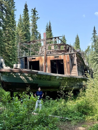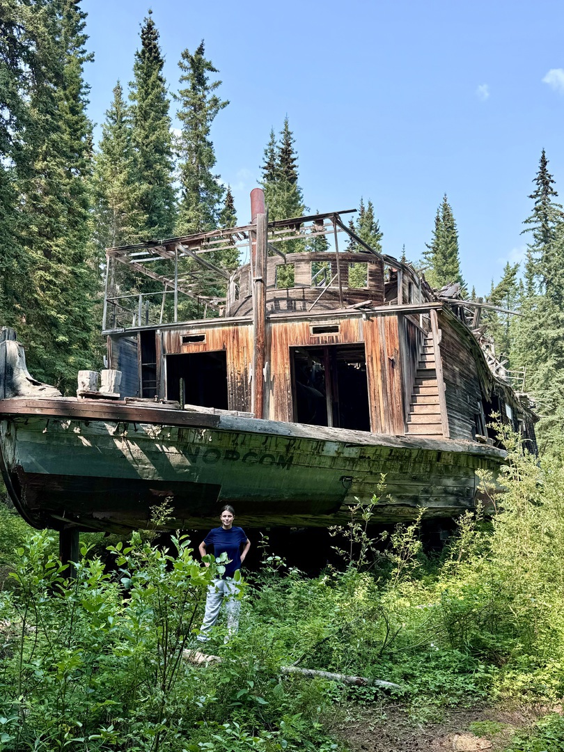 In den 20er Jahren wurde dort ein majestätischer Raddampfer zur letzten Ruhe aufs Trockene gezogen, der vorher bei einer Havarie so stark beschädigt wurde, dass eine Weiterfahrt nicht mehr möglich war. In den letzten 100 Jahren ist der Holzaufbau zwar an einigen Stellen eingesackt aber das tut dem imposanten Anblick dieses alten Flussriesen im kanadischen Urwald keinen Abbruch.