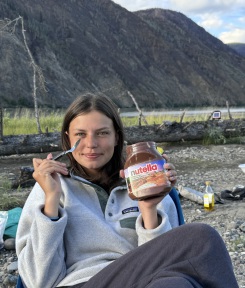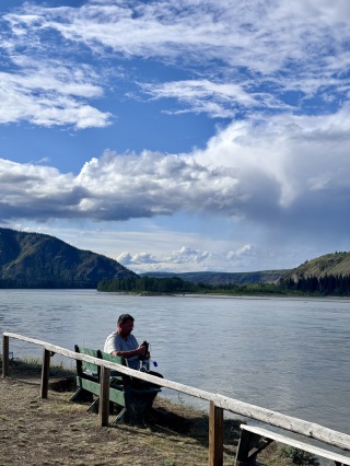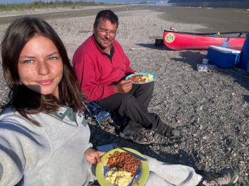 Auf einer kleinen Halbinsel im Fluss ließen wir uns das erste von Nadeshda selbstgemachte Essen schmecken. Danach saßen wir noch etwas am Lagerfeuer zusammen und gingen dann erst gegen Mitternacht