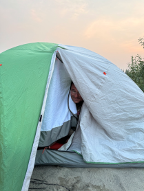 Ich wachte morgens gegen halb sieben auf, verließ das Zelt und beobachtete, wie die Morgensonne den Fluss in eine mystische Nebellandschaft