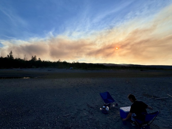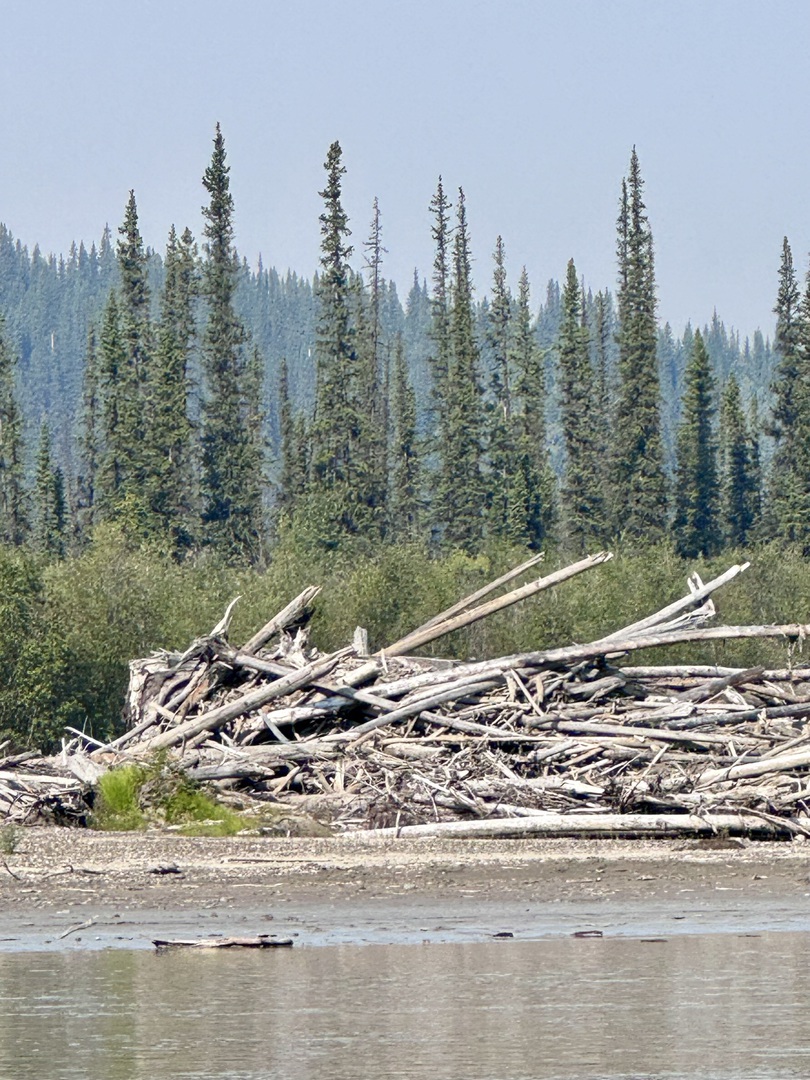 Heute hat die Paddelei erst am Nachmittag Spaß gemacht. Am Vormittag sind wir teilweise durch kleinere Seitenkanäle gepaddelt, der Himmel war vom Rauch diverser schwerer Waldbrände so verhangen, dass die Sonne nicht richtig durchdringen konnte und wir im diffusen Licht durch eine apokalyptisch anmutende Landschaft gefahren sind. Zwischen den kleinen Inseln treiben Hochwasser und Winterstürme die ganzen Bäume und Äste, die der Yukon immer mit sich führt, zu riesigen Stapeln zusammen, die dann wie riesige, ausgebleichte Knochengerüste auf den Kiesbänken liegen.